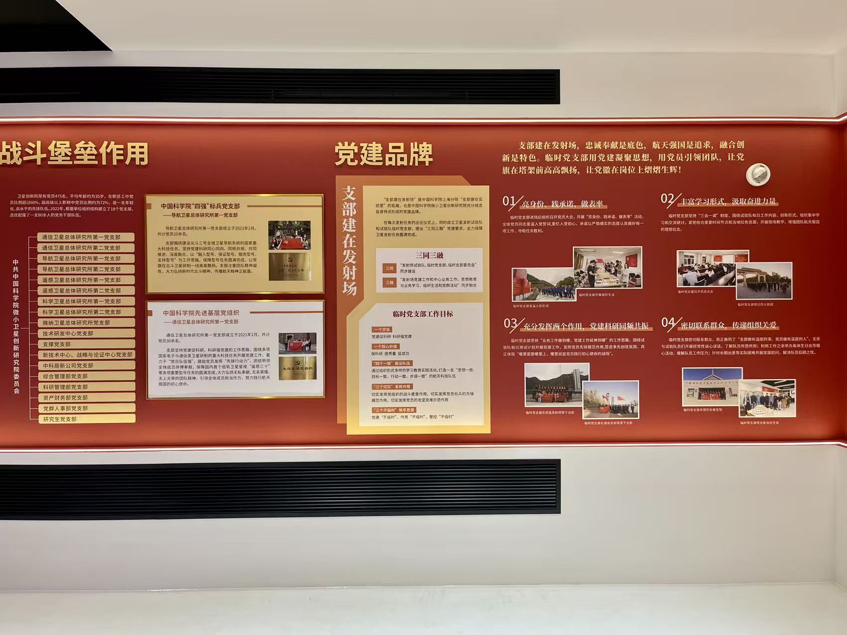 中国科学院微小卫星创新研究院在“承国家之志,铸时代新星”的价值追求指引下,把面向国家重大需求作为首要目标,成功发射了北斗三号、墨子号、悟空号等100多颗卫星。卫星创新院科学家精神教育基地以展示中国航天与中国科学院卫星发展历程为主线,以图文展览、实物模型、视频放映等形式全面介绍我国航天成就及卫星创新院创新发展过程。建筑面积共计600余平方米,分为历史回望馆、创新发展馆、党建引领馆三个展厅,另有一个新时代科学家精神特展,承载了卫星创新院20年的奋斗历史和对未来的展望。基地融合航天成果展示、航天文化传承、航天知识科普、航天科技互动等功能,向社会公众普及航天科学知识,传播航天文化,赓续航天精神,点燃航天梦想。